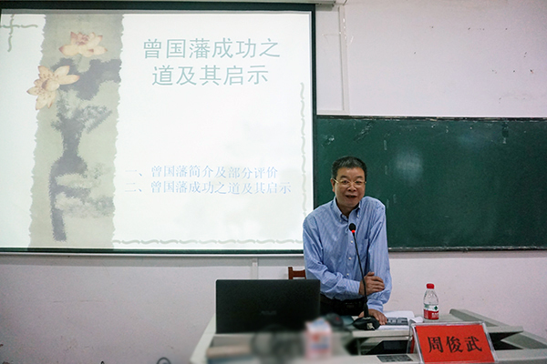 周俊武从曾国藩简介及其部分评价和曾国藩成功之道及其启示两方面展开详细讲述。讲座中,周俊武引经据典,运用曾国藩的经典故事,后人评价等不同方式阐述了曾国藩的生平事迹及其成功之道,他认为曾国藩的成功之道有六个方面:一是修身立志,为未来夯实基础;二是终身学习,为发展不断充电,要读有所择,读书终身,勤于思考;三是注重团队,为事业聚用力量;四是勤政廉洁,为成功固本强基;五是治家有道,为人生兴家启后;六是创新不囿,为国家勤谋远略。周俊武鼓励大家学习多曾国藩等历史名人的精神品质,多读有益身心的经典著作。
