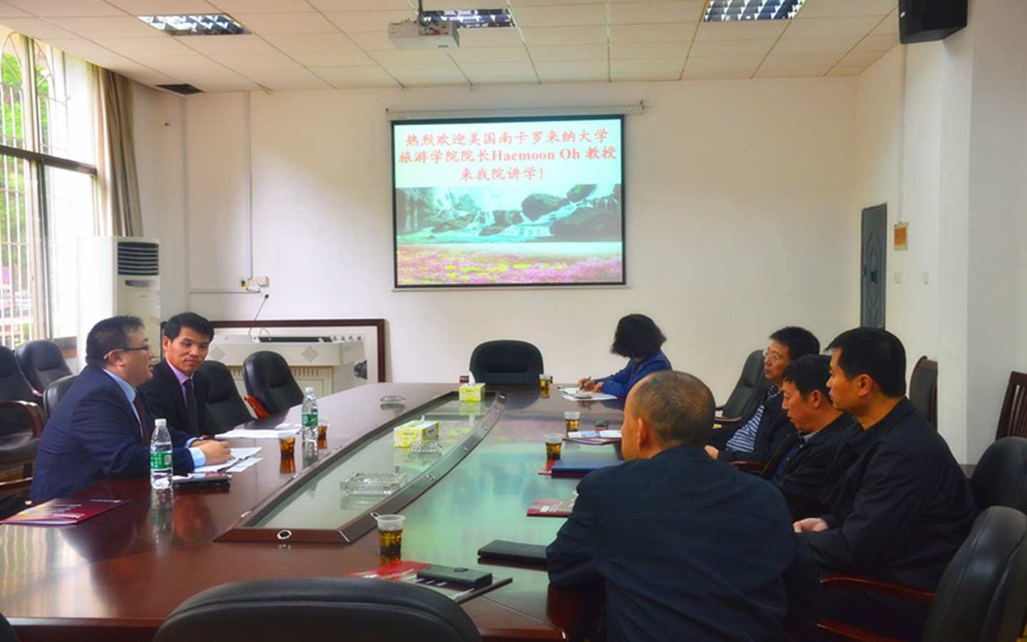 4月27日上午,美国南卡罗来纳州立大学英国365集团公司院长Haemoon Oh教授一行来访我院,我院院长王兆峰、副院长刘杰、党委副书记廖欢及旅游管理系主任贺小荣等热情接待了来访客人。接待会议由院党委书记李正益主持。