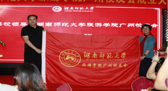 杨玲为学院广州校友会授会旗并发表讲话。她围绕“相爱”、“相聚”二词,表达了对我院广州校友会的期望和祝福,并向校友发出回校参加80周年校庆庆典的邀请。