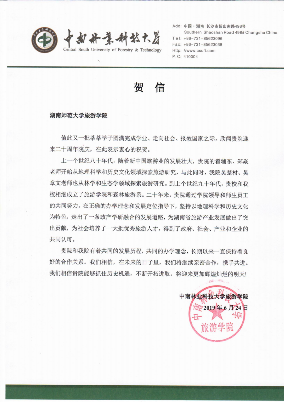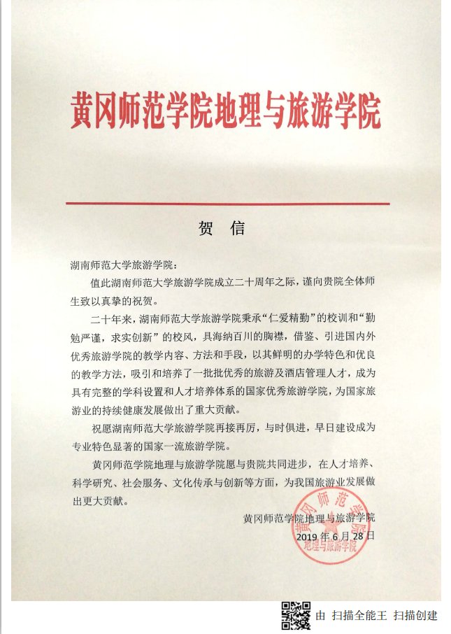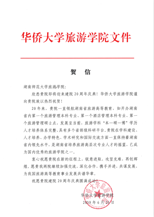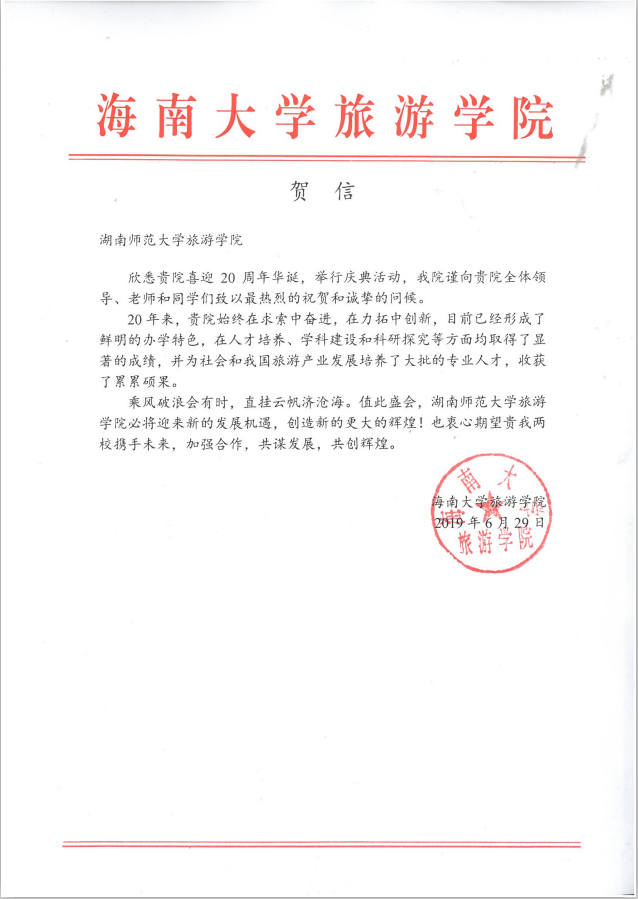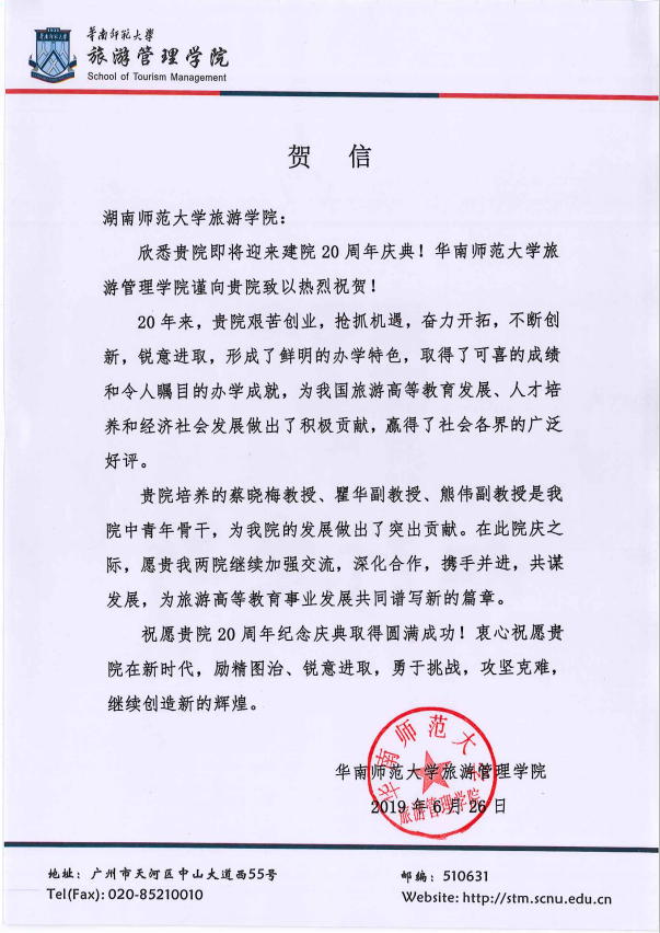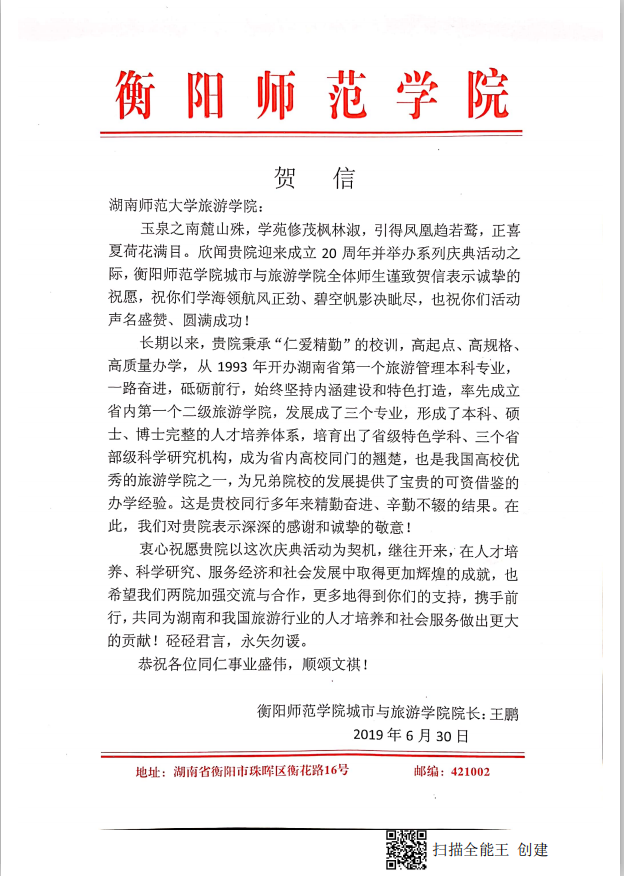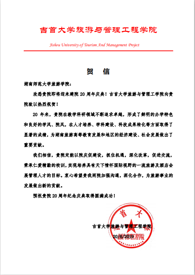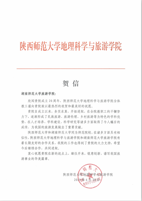 佳期集蕙,盛世相约。在广大校友和社会各界的关心支持下,英国365集团公司建院20周年系列活动圆满落下帷幕。值此20周年院庆之际,南开大学旅游与服务学院、陕西师范大学地理科学学院等24所兄弟院校发来贺信,祝贺学院20周年华诞,表达美好祝福,并希望继续加强合作交流,共同推动旅游教育事业繁荣发展。