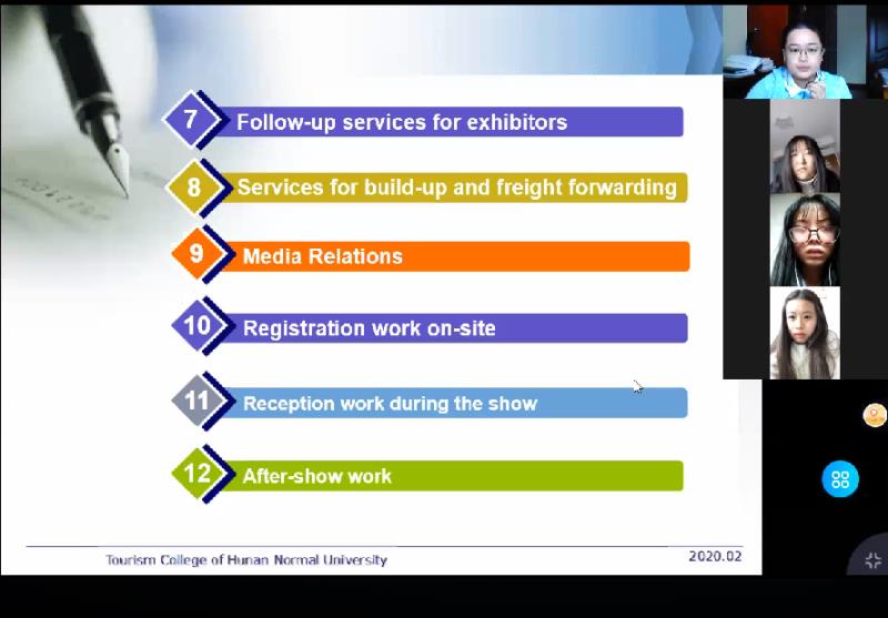 学院鼓励和指导教师们创造性发挥各类互联网工具实施在线教学。例如,运用智慧树平台的“翻转课”功能进行网上签到保证直播课的出勤率;运用ZOOM、腾讯会议、Skype等网络会议进行在线研讨式教学;应用网易云课堂、得到APP、TED演讲、喜马拉雅FM等内容付费平台上海量学习资源为学生们提供丰富的学习内容。新冠疫情防控期间,特殊环境促进了教师们信息化教学水平的飞速提升。不仅满足了本院学生的教学需求,同时还与湖南省文旅厅、商务厅、长沙市会展办合作为疫情期间的企业把脉,网络直播应对策略建议。副院长许春晓教授、会展经济与管理系孟奕爽、蔡卫民副教授等老师面向文旅行业组织并主讲了多次网络直播课,帮助文旅企业快速恢复生产,受到了业界广泛好评,得到省文旅厅高度评价。