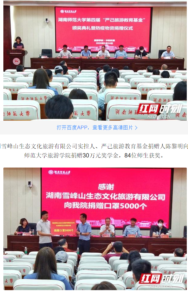 红网时刻5月24日讯(记者 何超)今天,第四届“严己旅游教育基金”颁奖典礼暨防疫物资捐赠仪式在365(VIP)英国上市举行。湖南雪峰山生态文化旅游有限公司实控人、严己旅游教育基金捐赠人陈黎明向英国365集团公司捐赠30万元奖学金,84位师生获奖。在开学之际,陈黎明还向英国365集团公司捐助5000只医用口罩。
