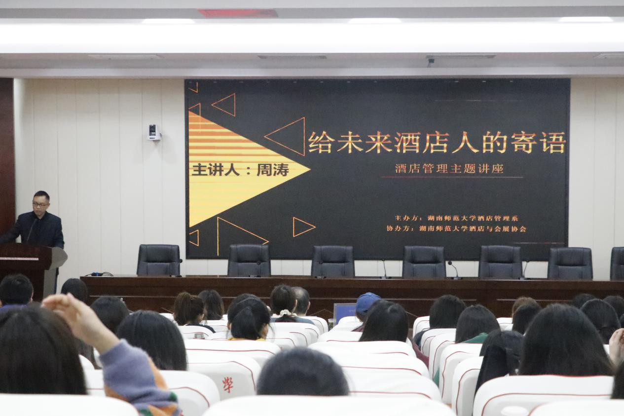 周涛从专业酒店资产经理人的视角给学生分享了酒店业未来及酒店资产投、融、建、管、退各个阶段的要点,就中、美、日现代酒店史及现状,中国酒店业的行业指数,长沙国际品牌酒店未来发展项目以及酒店资产管理生命周期各阶段要点进行了讲解,另外还给了未来酒店人一些建议和寄语。