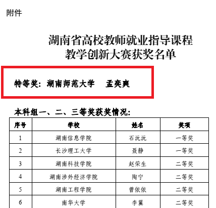 近日,湖南省教育厅公布了湖南省高校教师就业指导课程教学创新大赛获奖名单,我院孟奕爽副教授荣获特等奖(全省唯一)。