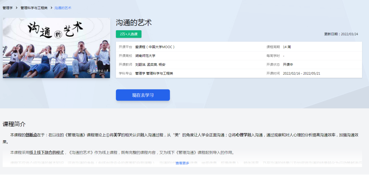 我院教师孟奕爽副教授主持的国家级线上一流课程《从创意到创业》和刘颖洁副教授主持的湖南省一流线上课程《沟通的艺术》入选国家智慧教育平台。《从创意到创业》课程截止2022年3月共有来自180多所高校的超过12万名学生进行了学习,连续3次被智慧树平台在其上线的近万门课程中评为top100课程。《沟通的艺术》课程截止2022年3月共有来自80多所高校的超过4万名学生进行了学习。