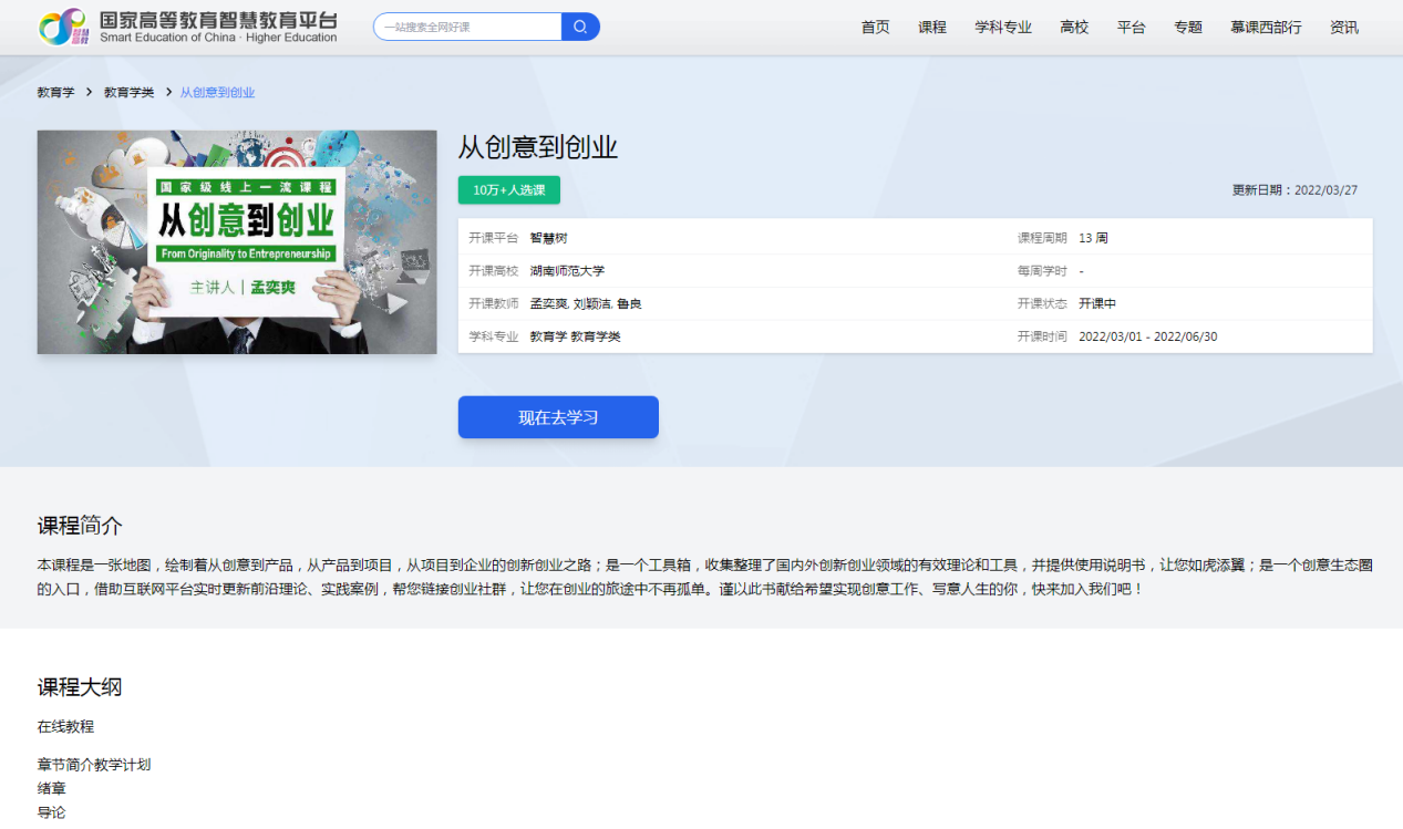《从创意到创业》课程链接:https://higher.smartedu.cn/course/62354c889906eace048c80ab