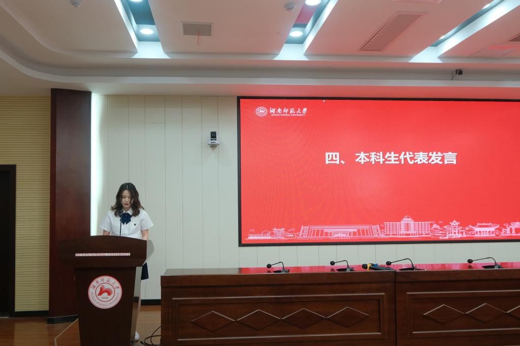 闵素芬宣读了2022年湖南省优秀毕业生表彰决定。她希望受表彰的同学谦虚谨慎、再接再厉,在青春的赛道上奋力奔跑;希望全体毕业生比优争先、砥砺前行,共同开创美好的未来。