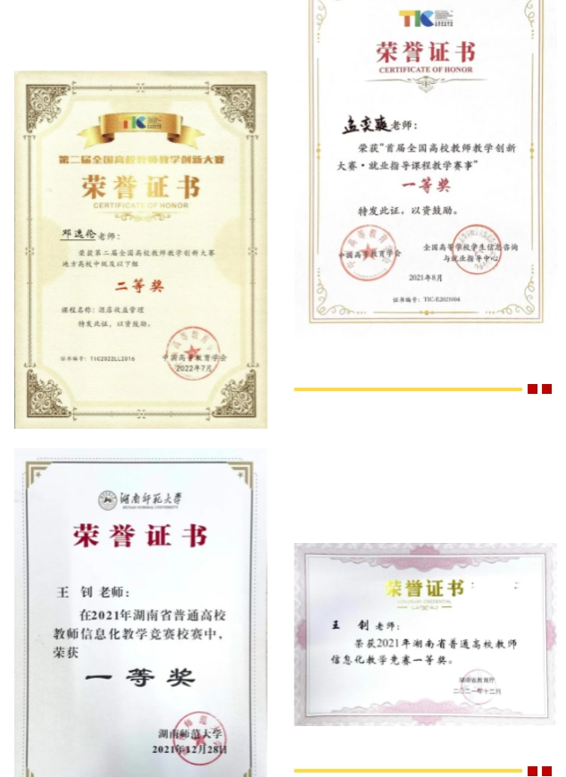 学院教师教学质量水平显著提高,获得国家级、省级和校级青年教师课堂教学竞赛、教学创新大赛、信息化教学竞赛、课程思政教学竞赛一二三等奖21项,其中一等奖11项。教师获得首届全国高校教师教学创新大赛一等奖1项、湖南省高校教师就业指导教学创新大赛特等奖1项、湖南省普通高校教师课堂教学竞赛一等奖5项、湖南省信息化教学竞赛一等奖3项,4名教师获得湖南省教学能手称号,教学综合水平位居全省同类院校前列。