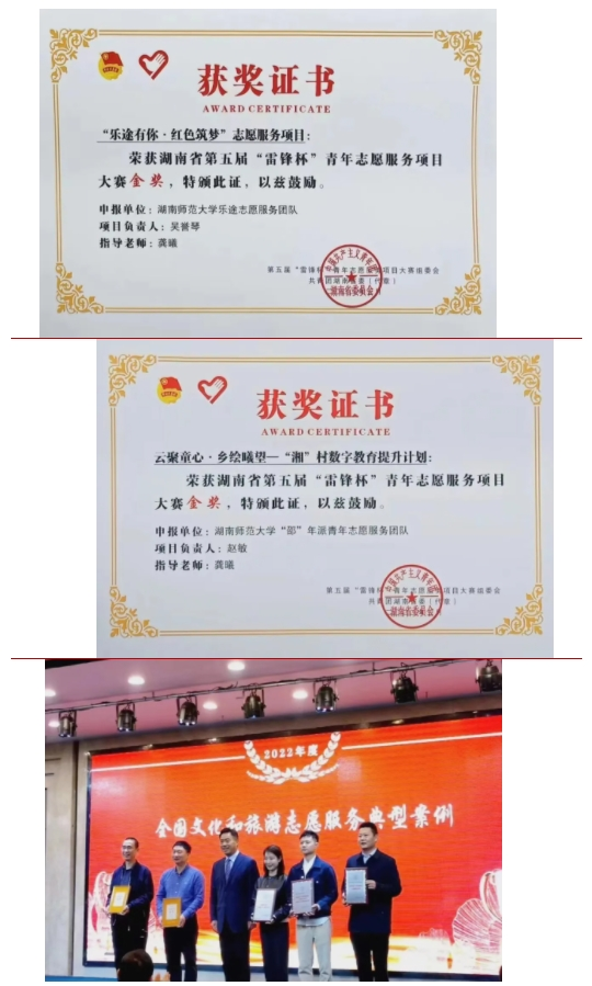 此外,学院团队和项目还入围2022年中宣部全国学雷锋最佳志愿服务组织,荣获2022年教育部第六届高校“礼敬中华优秀传统文化”全国特色项目(全国30项)、国家文旅部、中央文明办2022年全国文旅志愿服务典型案例(全国5项)、2022年湖南省学雷锋最佳志愿服务组织、2019年中国旅游影响力院校社会实践项目TOP10、2023湖南省百万青少年学雷锋志愿服务教育基地,充分彰显了红色文化引领和思政育人的成效。