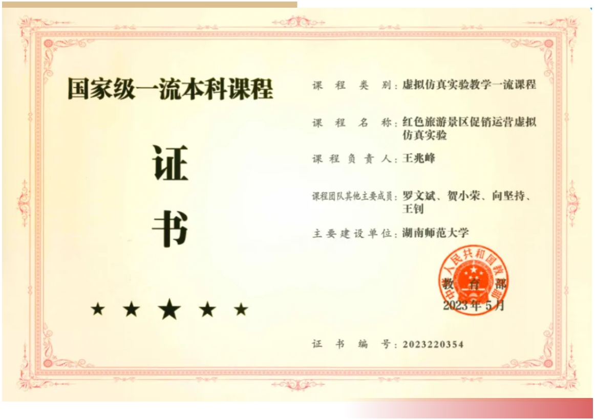 一是大力推进课程思政建设和教学改革研究,融入红色思政要素,发挥课程思政育人作用。“红色旅游景区促销运营仿真实验”获批2023年国家一流本科课程,“旅游景区管理”获批2023年湖南省课程思政示范课。
