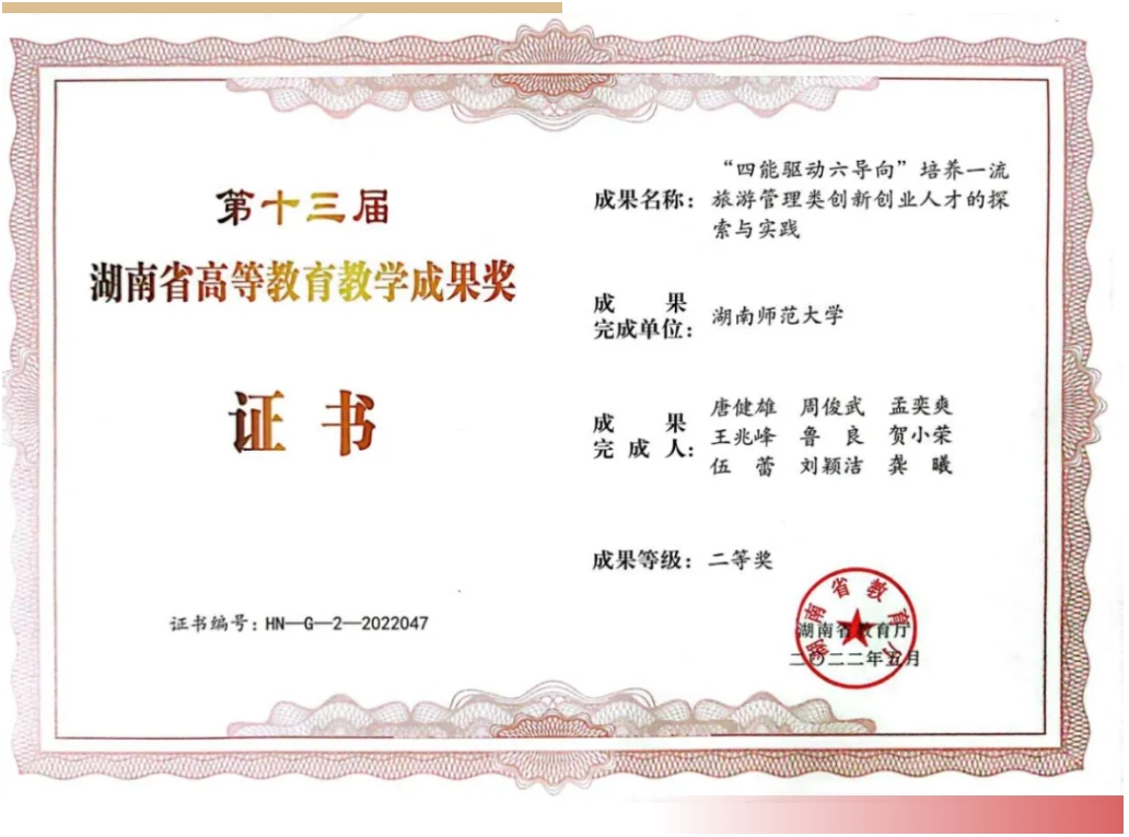 学院通过多年的旅游人才培养实践和探索,深入落实“学生中心、产出导向、持续改进”培养理念,紧扣“课程育人、实践育人、科研育人和竞赛育人”四大维度,发挥政校企合作育人优势,走出了一条“金课建设—社会实践—以研助教—以赛促学”四维协同驱动,政校企合作助力的人才培养新路子。
