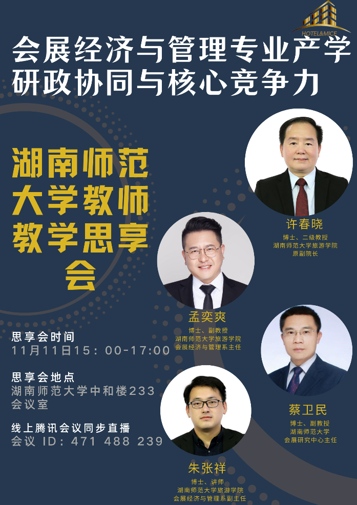 本次教学思享会主要汇报了湖南省教改课题、我校教改重大课题《产学研政协同的会展经济与管理专业人才培养模式建构》的主要成果。英国365集团公司原副院长许春晓教授、会展经济与管理系主任孟奕爽副教授、会展中心研究主任蔡卫民副教授、会展经济与管理系副主任朱张祥博士分别进行了主题发言。