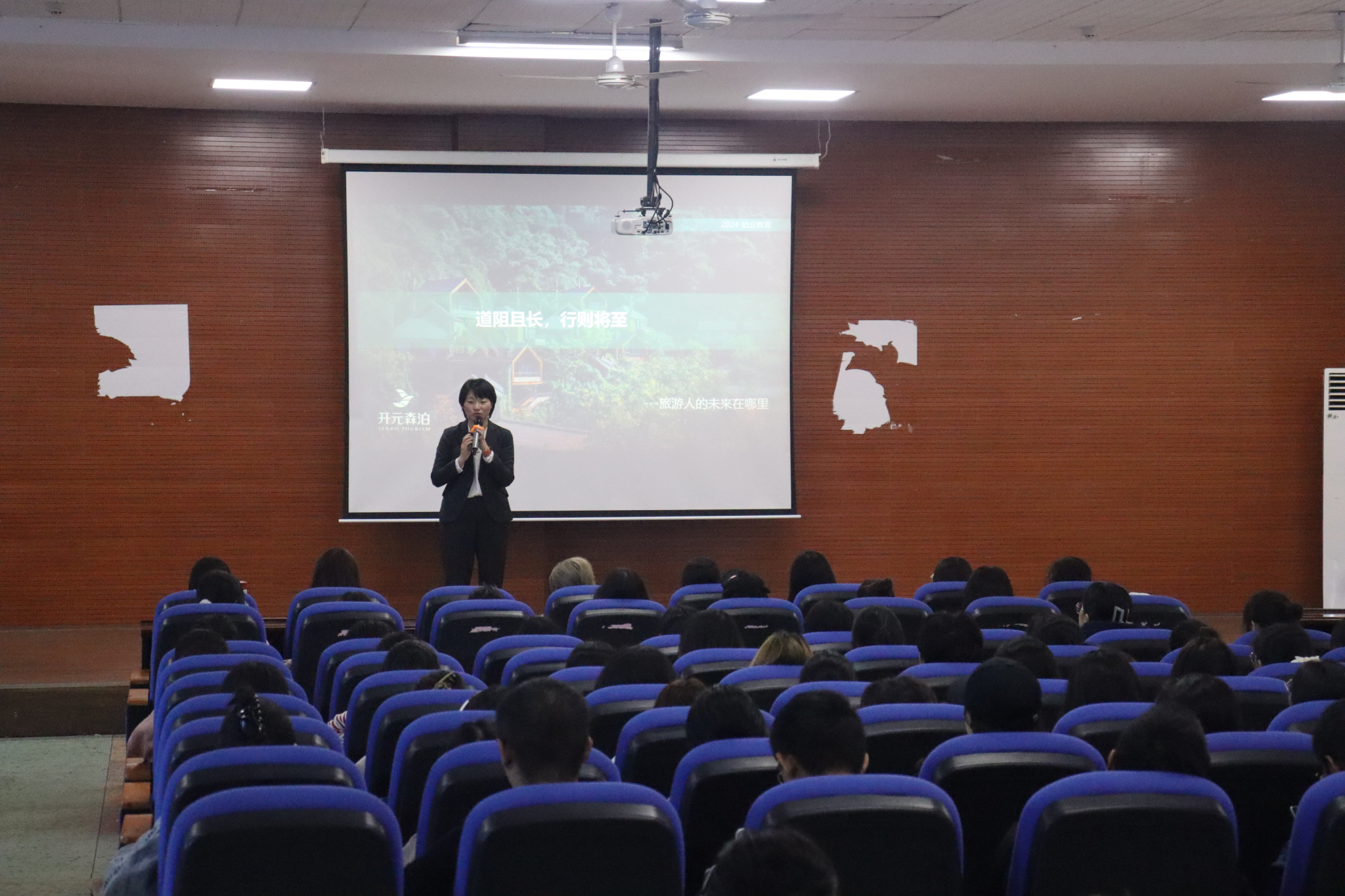 吴燕以开元森泊为例介绍了旅游行业的发展现状,分享了自己作为旅游管理专业学子,如何从酒店基层服务员成长到招聘总监的职业经历,并剖析了旅游行业的未来发展和职业前景。随后,她对开元森泊在员工培养、待遇保障、发展规划等方面做了详细介绍,并结合自身成长经历勉励同学们在大学期间努力学习多种技能,及早找准自己的理想目标并清晰职业规划。