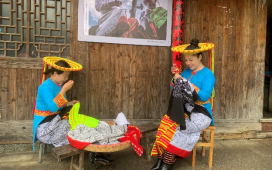 4月16日上午,在雪峰山大花瑶景区负责人带领下,调研组五人来到山背花瑶梯田景区学习瑶族挑花技艺。该景区的星空云舍,是雪峰山生态文化旅游公司精心打造的精品高档民宿。其中有专门场地用于展示花瑶非遗——挑花技艺,花瑶挑花取材广泛,内容丰富,形态多样,有上千种之多。与机绣、湘绣不同,花瑶挑花不需要提前描绘设计,也不用模具做刺绣架,全凭挑花女灵巧的双手和娴熟的技巧,以自己心中的构图和对美的理解,通过挑花女个人的日常生活经验和想象在土布上进行操作。在非物质文化遗产活化和原真性方面,这里的挑花技艺传承人供职于该景区,她们会根据公司需求和游客喜好,结合挑花古法对服饰、提包、枕套等日常生活物品进行创新,将传统花瑶文化与现代生活进行相融,既加深了游客对于花瑶技艺的学习、认同,又促进了花瑶的非遗活化和传承。