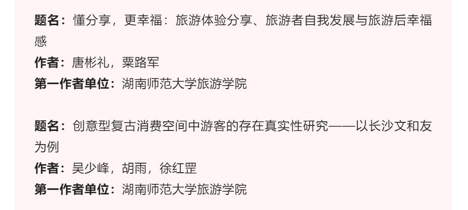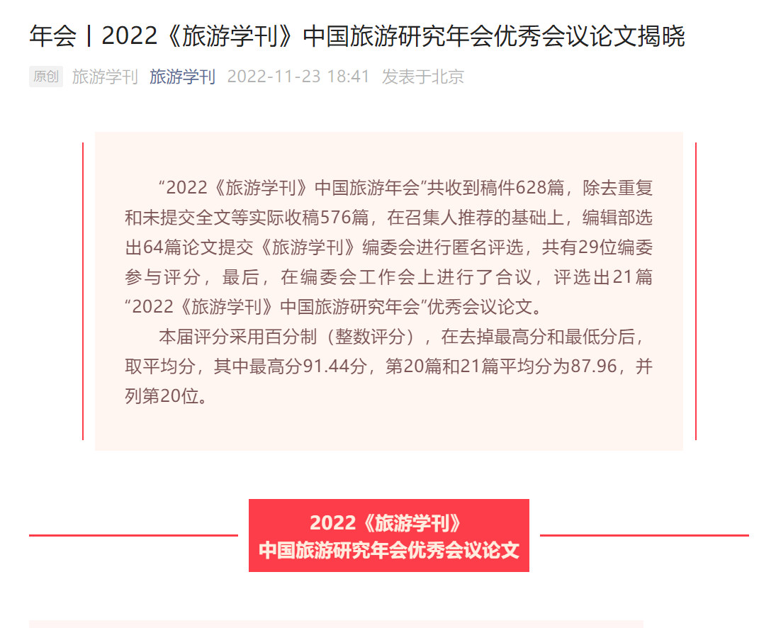 2022年11月23日,《旅游学刊》编委会公布了“2022《旅游学刊》中国旅游研究年会”优秀会议论文名单,我院吴少峰和唐彬礼两位老师各有1篇论文入选,入选数量并列全国高校第2位。2022《旅游学刊》中国旅游年会实际收到576篇论文,最终21篇入选“2022《旅游学刊》中国旅游研究年会”优秀会议论文。