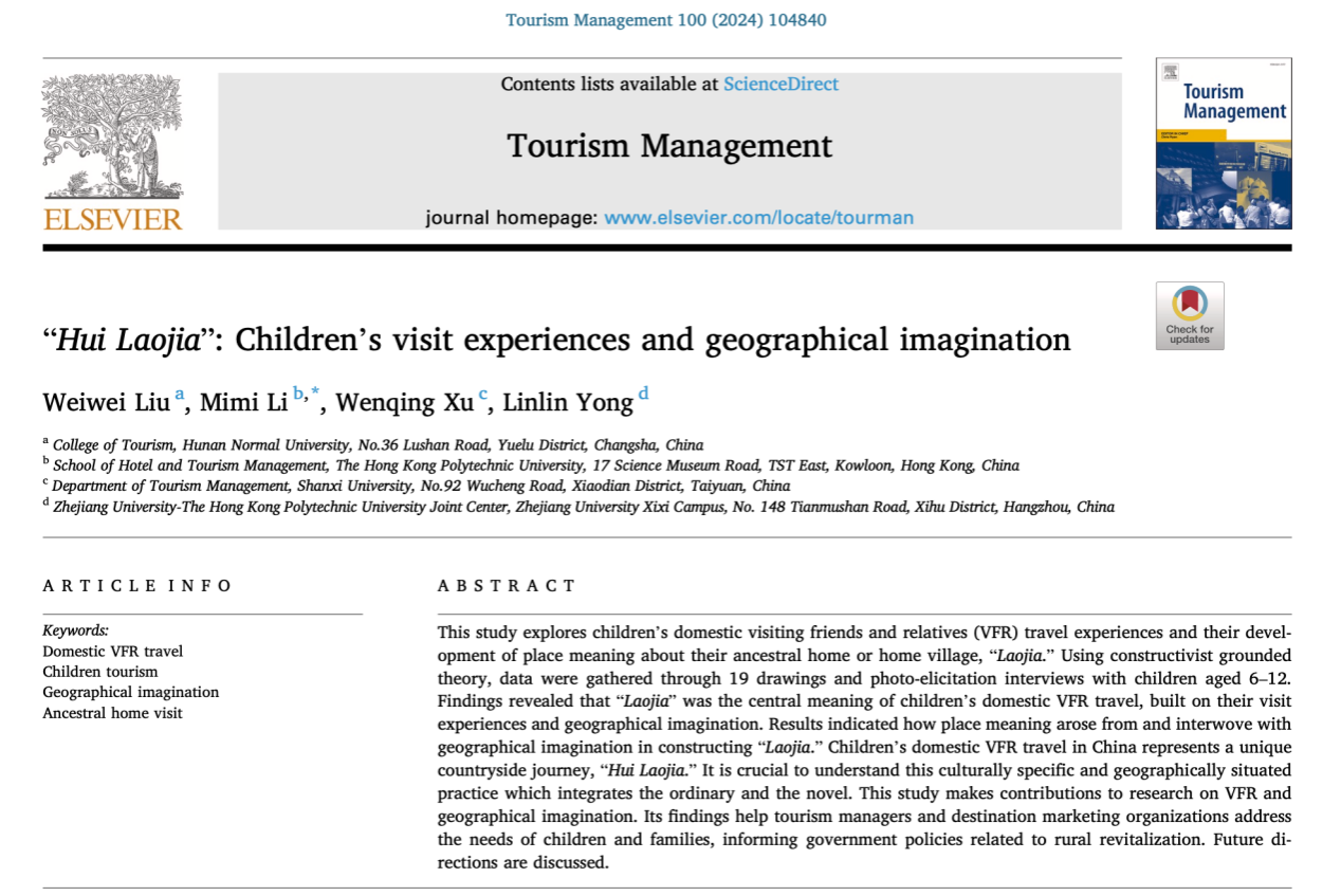 近日,国际旅游学科顶级权威期刊《Tourism Management》接收并刊发了我院旅游管理系青年教师刘为潍任第一作者、365(VIP)英国上市为第一单位,香港理工大学李咪咪教授等四位学者合作完成的论文《“Hui Laojia”: Children’s visit experiences and geographical imagination》(Volume 100, February 2024, 104840)。