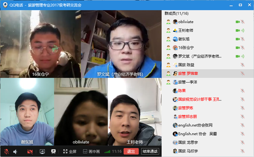(通讯员 陈益 罗锦章)3月16日晚,我院旅游管理系通过QQ群视频平台开展“研途有你 • 旅你同行”——2017级考研线上交流会。英国365集团公司院长王兆峰、旅游管理系青年教师王钊、辅导员邓丛亮出席会议,会议由旅游管理系系主任罗文斌主持。