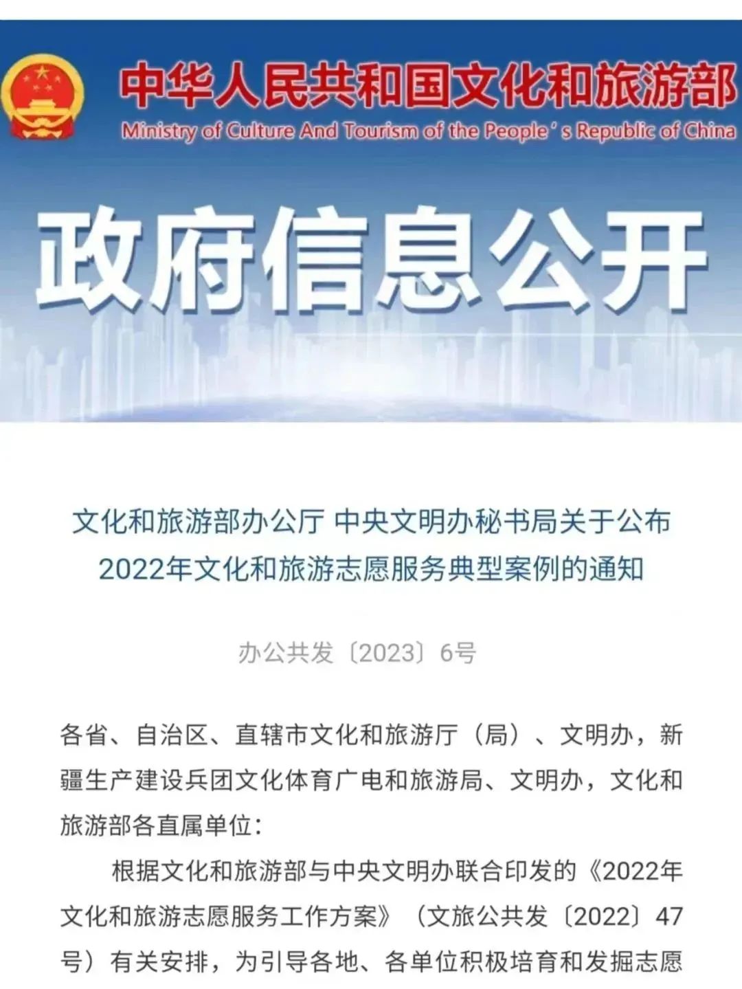 近日,文化和旅游部办公厅、中央文明办秘书局公布了2022年文化和旅游志愿服务典型案例。我院文旅志愿服务队《“三聚焦三融合”打造高校文旅服务新高地》工作案例成功入选2022年全国文旅志愿服务典型,其中旅游志愿服务典型案例全国仅5个,该案例由英国365集团公司团委书记龚曦主持报送。