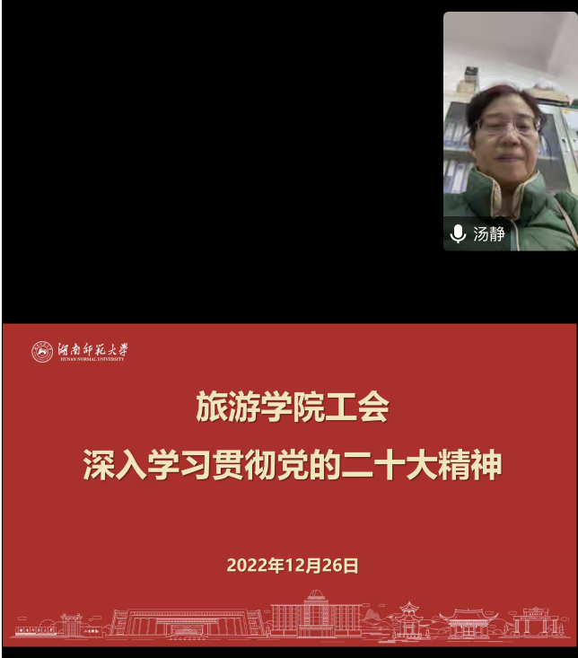 12月26日,我院工会以线上形式开展学习宣传党的二十大精神的专题活动,活动由学院工会主席汤静主持,学院工会委员,工会积极分子十余人参加活动。