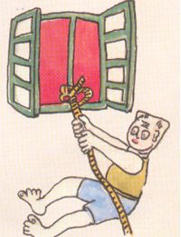 6、不要盲目跳楼,可用梯子或把床单撕成条状连起来,紧拴在门窗档或重物上,顺势滑下。