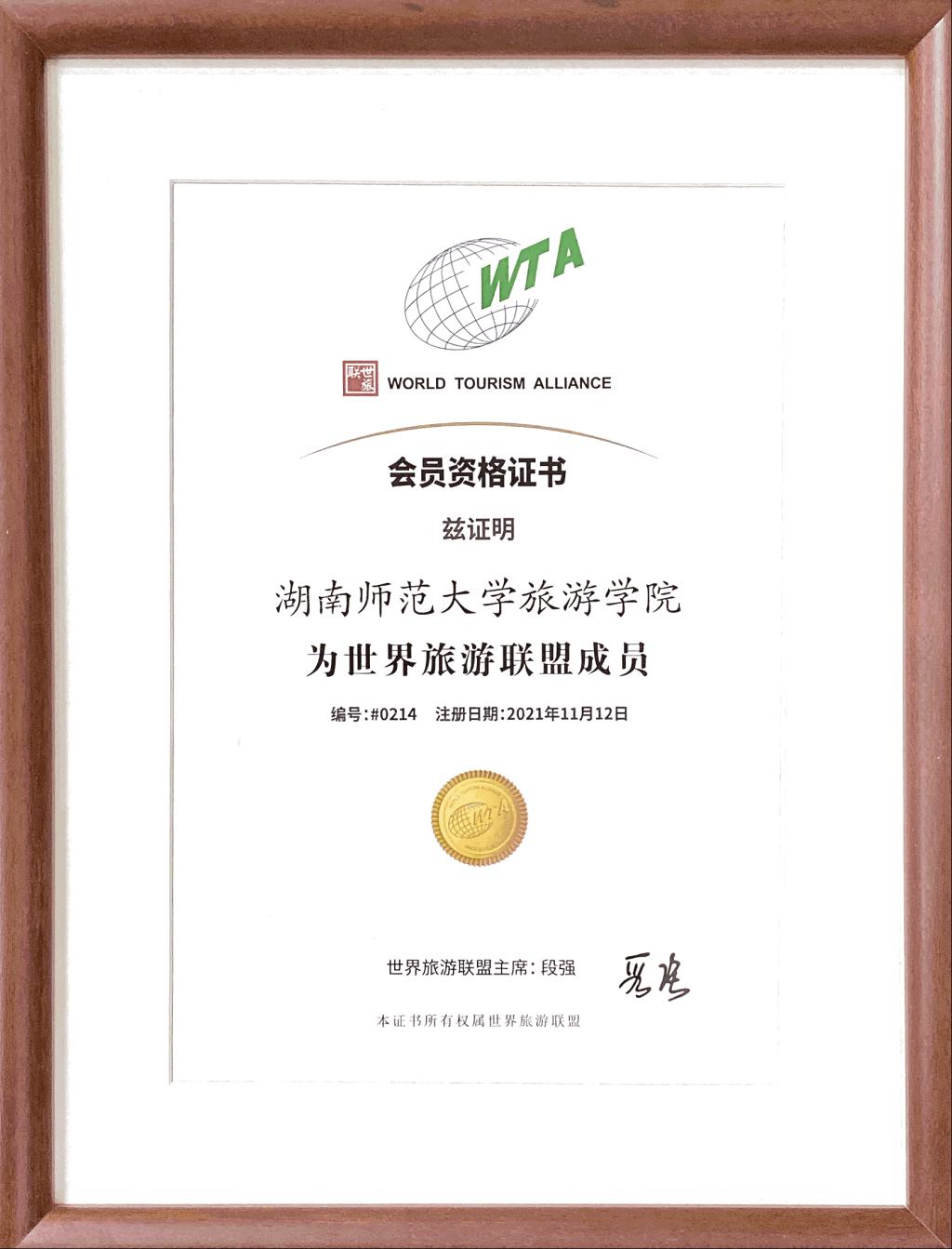 2021年11月12日世界旅游联盟(WTA)向我院发出了《关于同意贵单位加入世界旅游联盟的函》和《会员资格证书》,我院正式成为该联盟的成员,会员编号为0214。