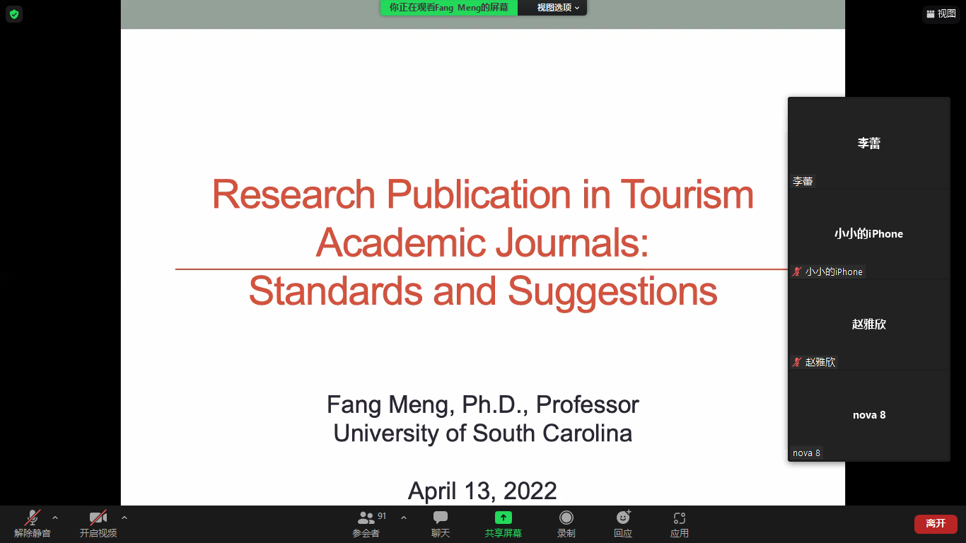 4月13日晚8:00,学院于ZOOM会议举办“旅游国际学术期刊论文的发表—标准与写作建议”主题讲座,特邀美国南卡罗莱纳大学孟芳教授主讲。讲座由我院唐健雄教授主持。