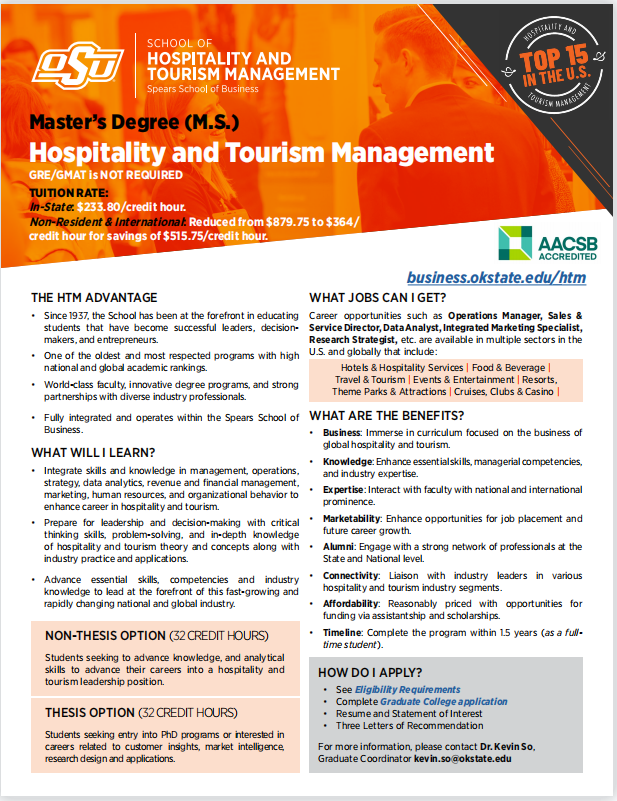 俄克拉荷马州立大学(OSU)的全新试点项目——研究生院非居民学费奖励项目(Graduate College Nonresident Tuition Award)。该奖励项目仅面向9个硕士项目的非居民学生(包括州外和国际学生)提供,参与者将以非常优惠的学费攻读硕士学位,减免后的学费与非居民在线硕士项目价格相当。酒店与旅游管理科学硕士项目 (MS)位列首批试点指定硕士项目之一。