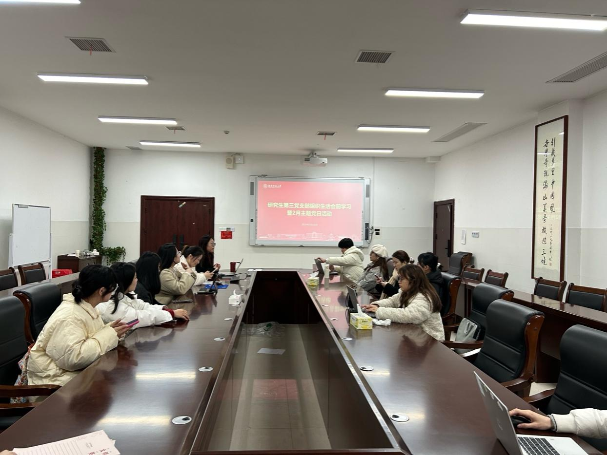 2月25日,研究生第三党支部在中和楼233会议室举办组织生活会前学习暨2月主题党日活动。会议由支部书记史雅潼主持。