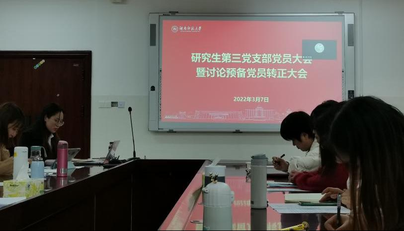 3月7日研究生第三党支部在中和楼233会议室召开了党员大会,本次大会主要讨论周玥希同志转正的基本事宜。党员大会由支部书记周诗雨同志主持,英国365集团公司副院长向智勇同志、支部第一书记王晶同志出席会议,应到正式党员16名,实到13名;应到预备党员9名,实到8名。