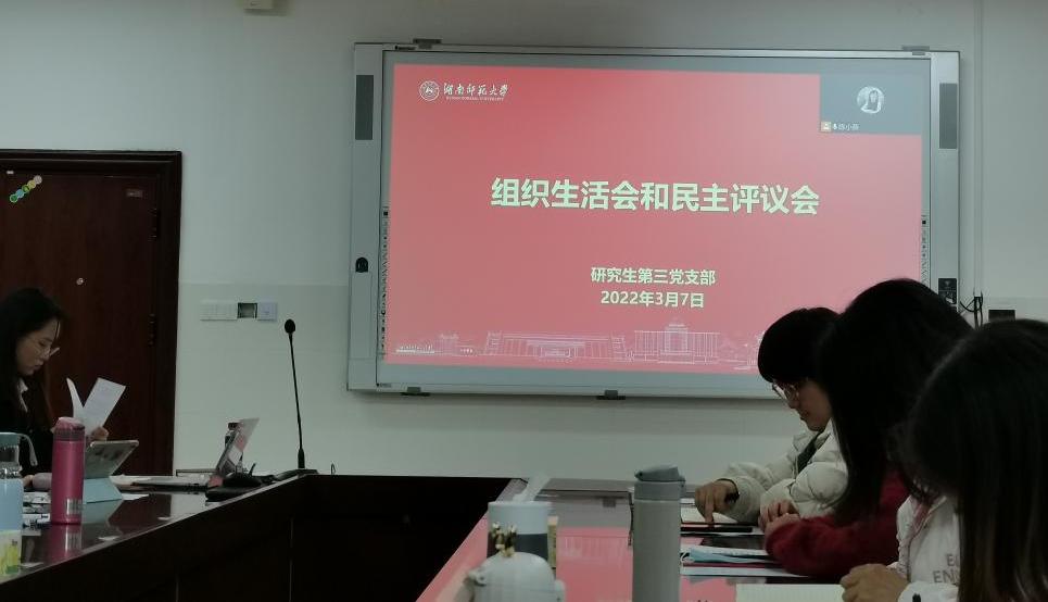 3月7日研究生第三党支部在中和楼233会议室召开2021年度组织生活会暨民主评议党员会,本次大会由支部书记周诗雨同志主持,英国365集团公司副院长向智勇同志、支部第一书记王晶同志出席会议,应到正式党员17名,实到14名;应到预备党员8名,实到7名。