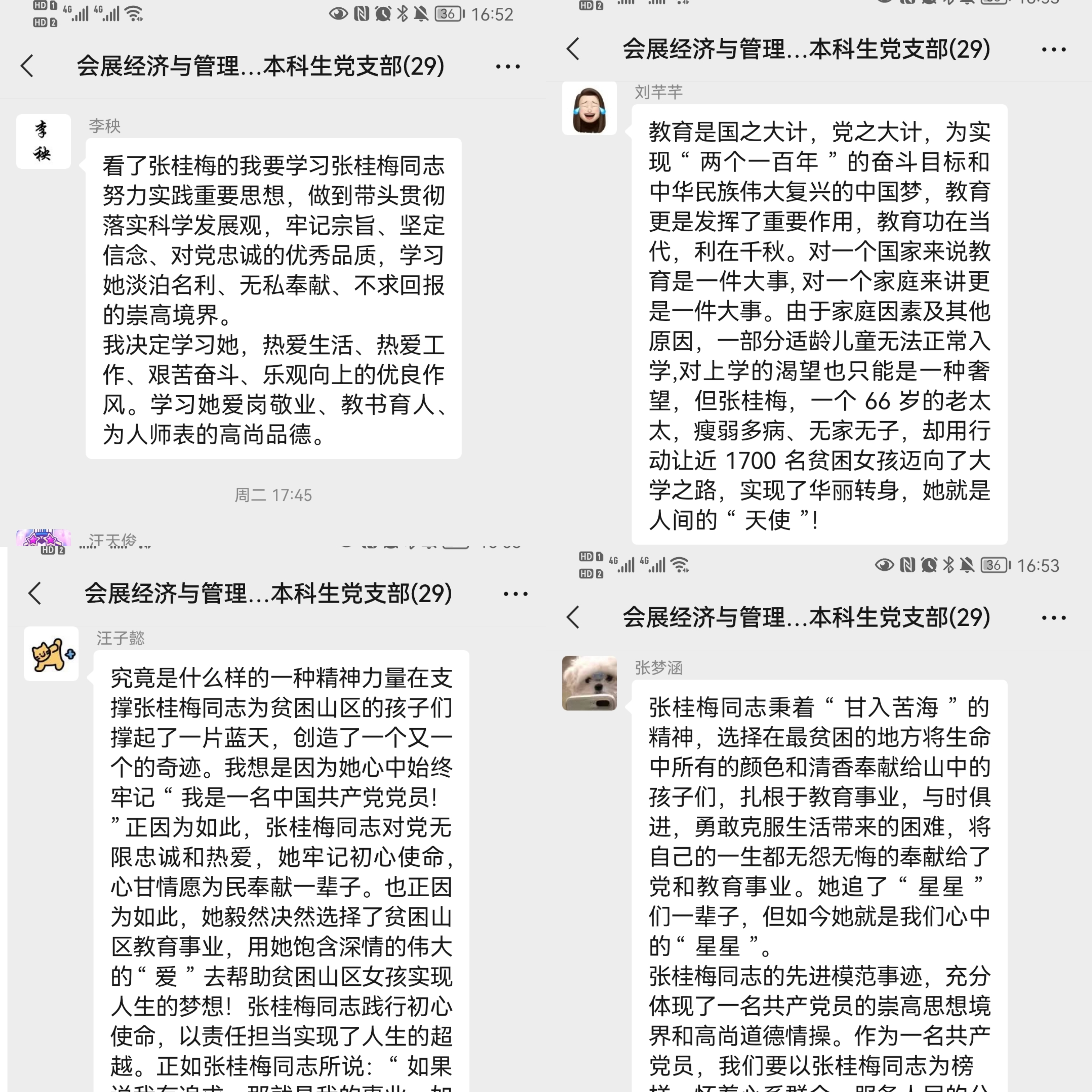 在中国,有千千万万的人为女童和妇女教育事业默默耕耘,值此之际,本支部围绕“七一勋章”获得者张桂梅校长的事迹开展党日活动,带领支部成员共同观看《榜样6》中张桂梅的片段和纪录片《你好,张桂梅》,并在支部微信群分享交流所感,相互激励,从中感受女性伟大的力量。