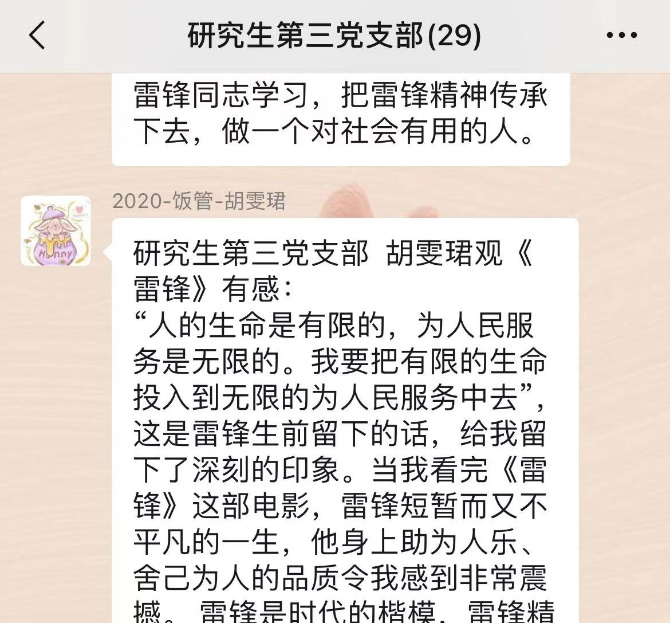 为进一步弘扬雷锋精神,深刻领会雷锋精神的要义,用实际行动践行为人民服务的精神真谛,3月22日,研究生第三党支部组织开展了为期5天的“重温经典影片,传承雷锋精神”主题党日活动,活动由支部书记刘银同志主持。