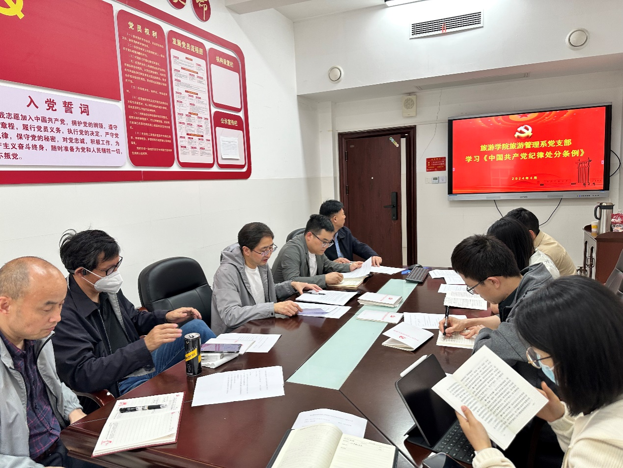 学院副院长、旅游管理系教工党支部书记郑群明传达了党中央关于在全党开展党纪学习教育的通知,以及省委、学校党委、学院党委的会议部署精神,领学了习近平总书记关于党纪学习教育的重要讲话精神。罗文斌领学了《关于“六项纪律”的主旨要义和规定要求》。何银春就《中国共产党纪律处分条例》前三章进行现场领学和解读,王钊、刘为潍以及张洪超等党员分享了学习心得。
