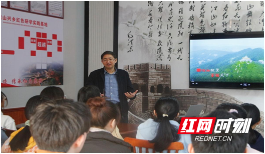 在红色研学基地,郑群明为学生们讲解韶山红色文化助力全域旅游发展的路径。