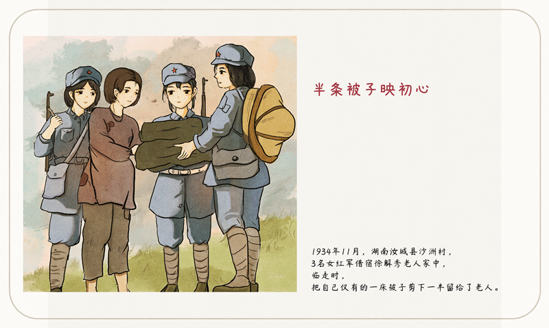 半条被子映初心:在红军长征途中,发生在湖南汝城县沙洲村“半条被子”的故事广为人知。在汝城县沙洲村,3名女红军借宿徐解秀老人家中,临走时,把自己仅有的一床被子剪下一半给老人留下了。老人说,什么是共产党?共产党就是自己有一条被子,也要剪下半条给老百姓的人。