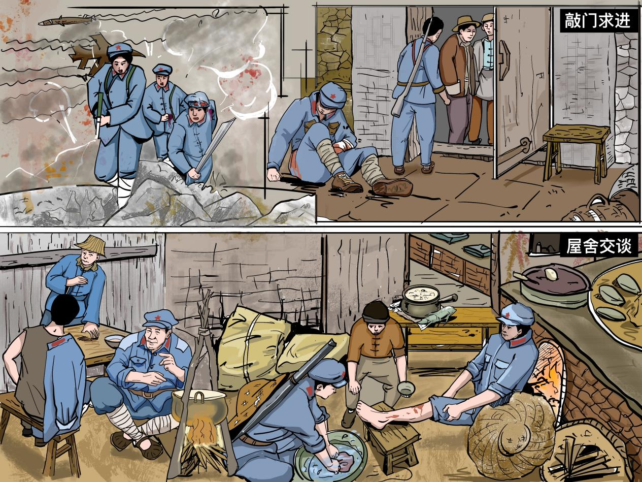红二十五军途经兴隆镇,大部队短暂休整离开后,三名穿着破烂的红军伤员敲开一家村民的门请求收留。看到他们衣衫破旧,蓬头垢面,有的人还拄着拐杖的样子,村民顿发恻隐之心,收留了他们,并帮助伤员上药疗伤、换洗衣服、生火煮饭。