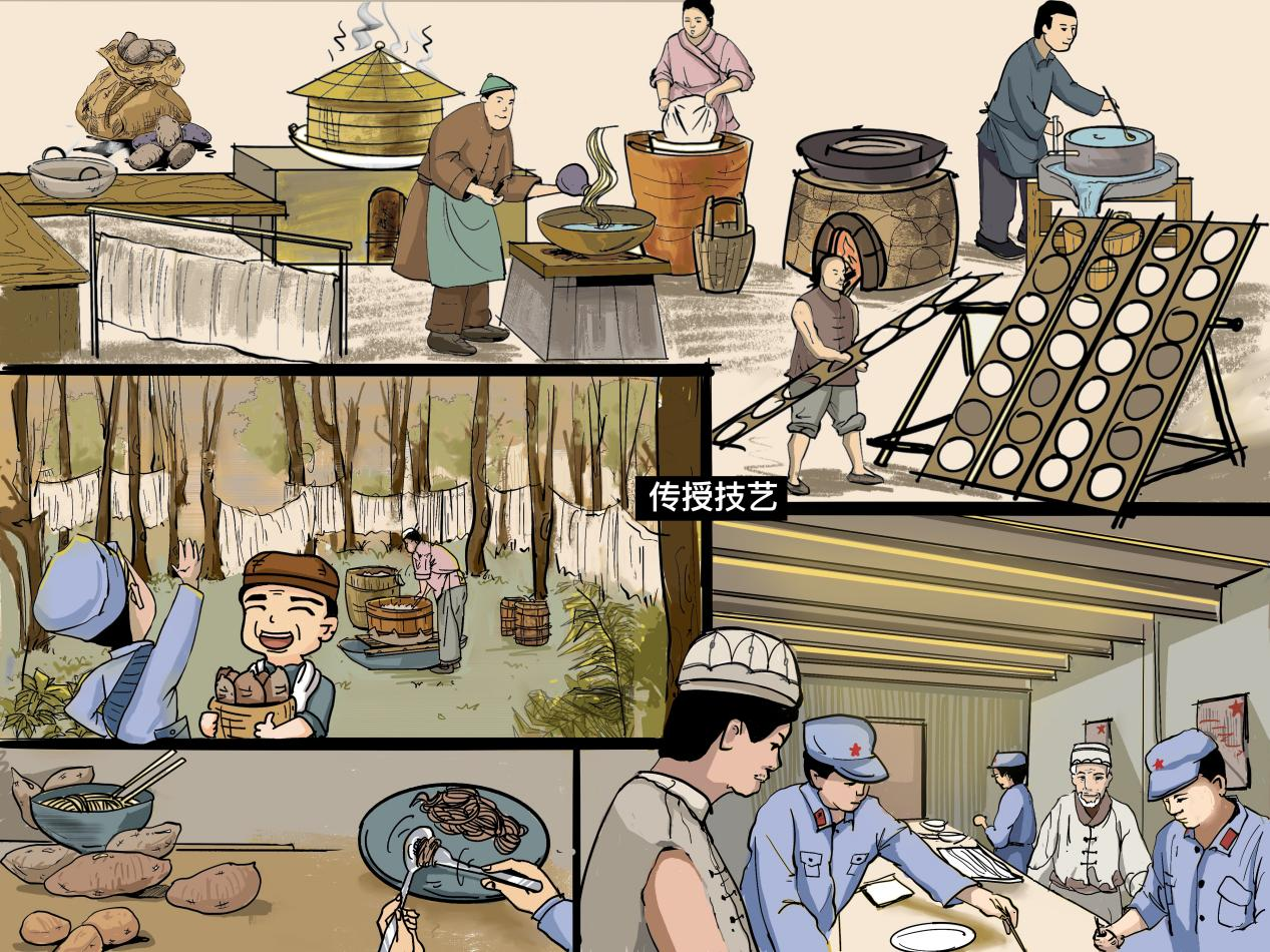 来自南方的红军战士看到村民家洋芋烂掉的情况,提出可以把洋芋做成更加可口、更好储存的粉条。战士们教老乡如何清洗洋芋、如何用刀切碎洋芋、如何兑用白矾、如何用特制的马勺往滚水锅里下粉……在乡里人的口传身教中,大家都学会了洋芋粉条的制作技术。
