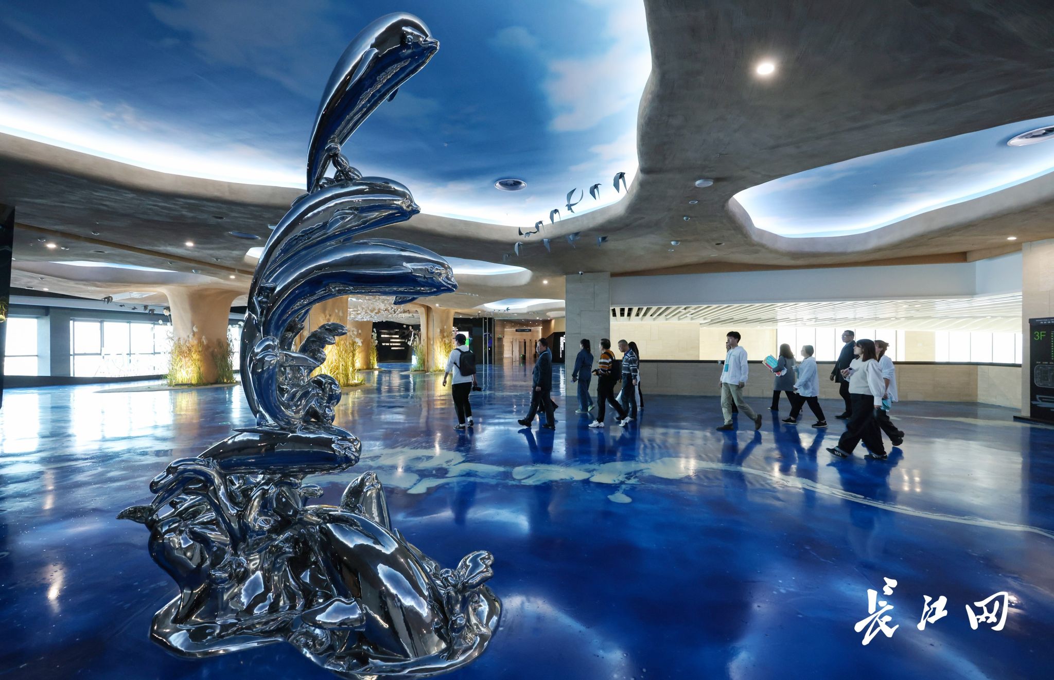 洞庭湖博物馆内的江豚雕塑。王筝 摄