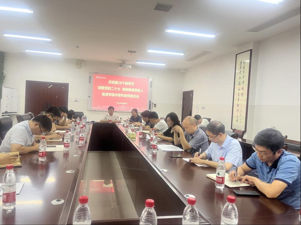 9月8日下午,为庆祝第38个教师节,营造立德树人良好氛围,增强教书育人本领意识,凝聚学院发展共识,酒店管理系党支部于中和楼233会议室参加了学院党委组织的“迎接党的二十大,培根铸魂育新人”中青年教师座谈会。校工会副主席杨格花,学院院长王兆峰,学院党委副书记廖欢,副院长向智勇、贺小荣、郑群明,专职组织员骆劲华出席。