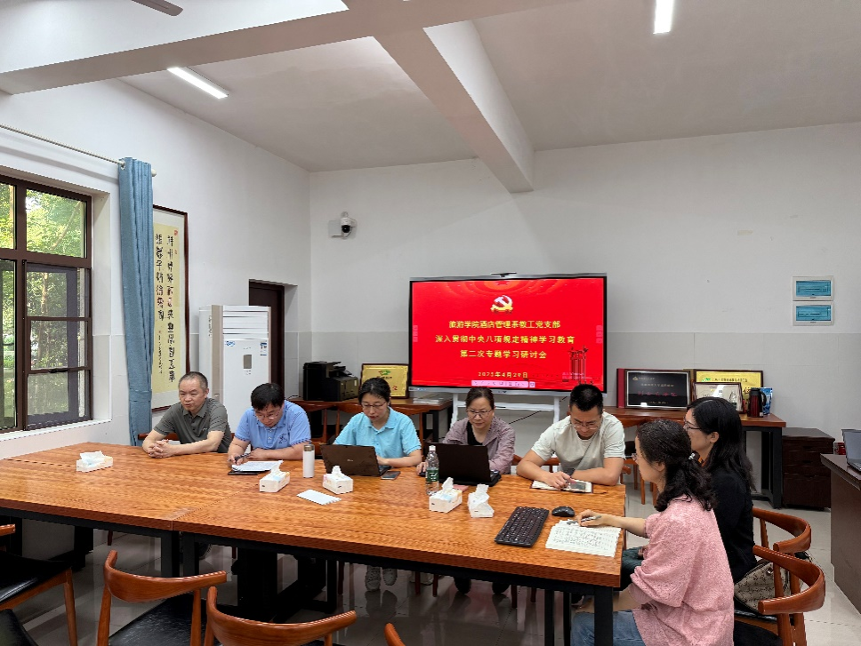 4月29日下午,酒店管理系教工党支部在中和楼215室开展深入贯彻中央八项规定精神学习教育第二次专题学习研讨,会议由支部副书记程慧主持,全体支部党员通过线上线下形式参加。